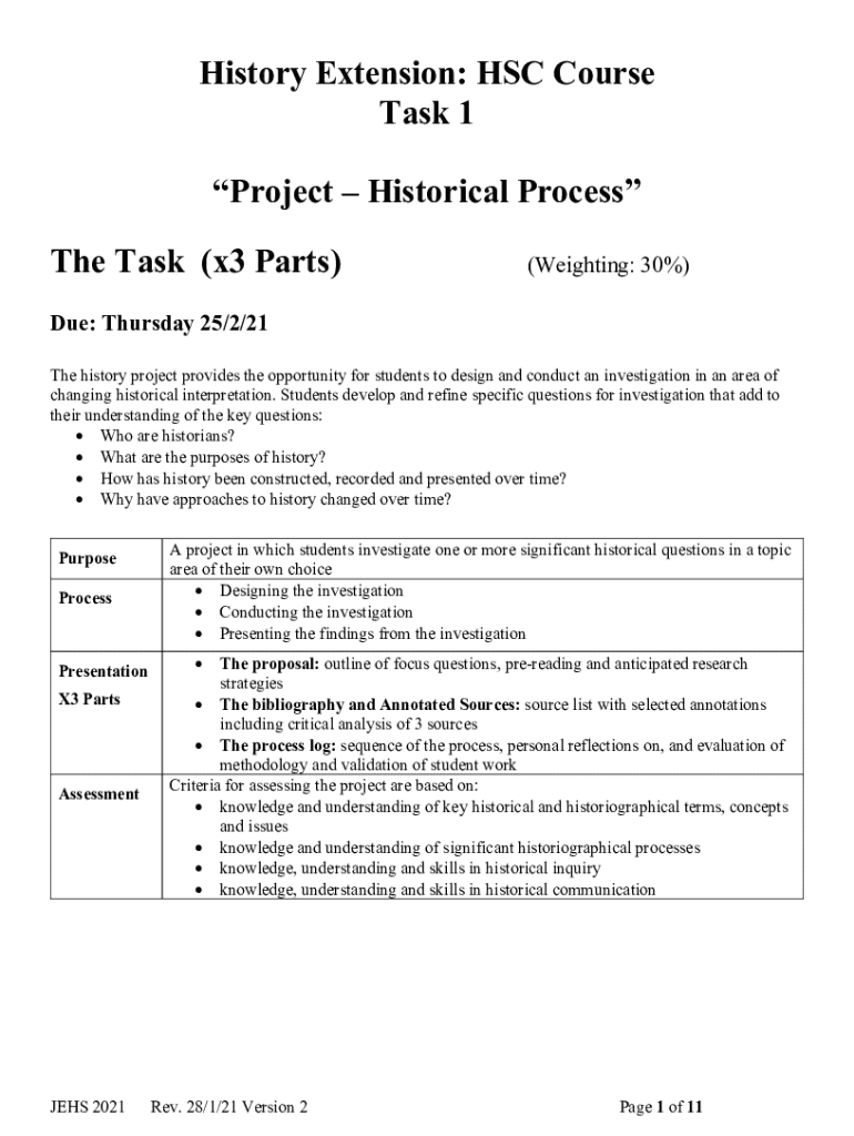 History Extension: HSC Course Task 1 Project Historical Process The Task (x3 Parts)(Weighting: 30%)Due: Thursday 25/2/21 The history project provides the opportunity for students to design and conduct