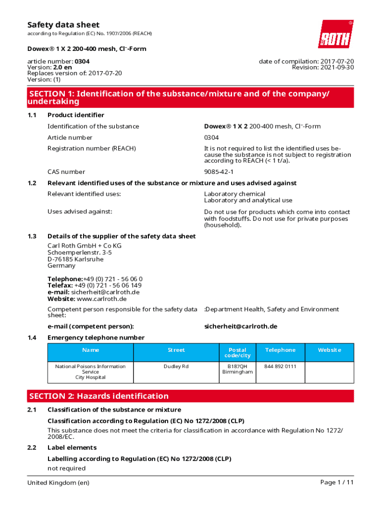 Safety data sheet according to Regulation (EC) No. 1907/2006 (REACH)Dower 1 × 2 200400 meshes, Form article number: 0304 Version: 2.0 en Replaces version of: 20170720 Version: (1)date of compilation: