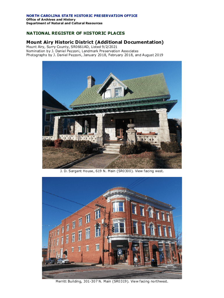 NORTH CAROLINA STATE HISTORIC PRESERVATION OFFICE of Archives and History Department of Natural and Cultural ResourcesNATIONAL REGISTER OF HISTORIC PLACES Mount Airy Historic District (Additional