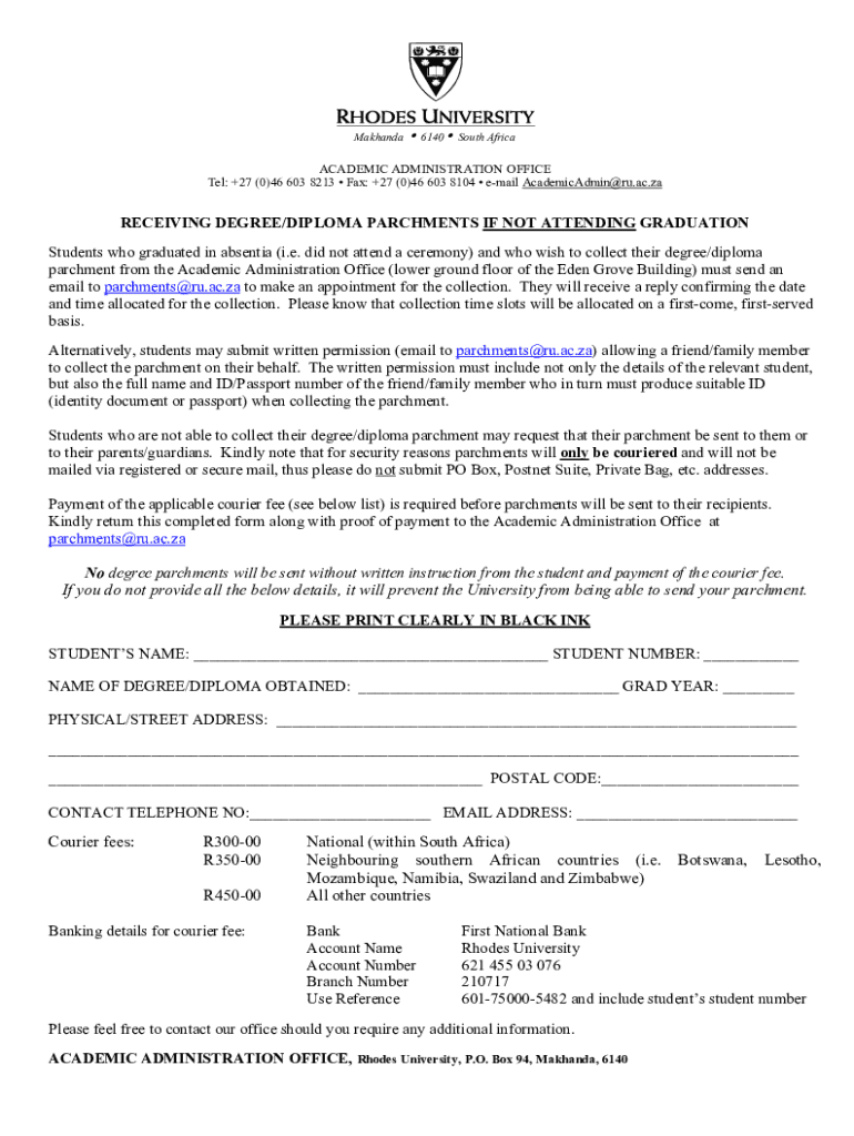 This form provides instructions for students who graduated in absentia and wish to collect their degree/diploma parchments from Rhodes University, South Africa.