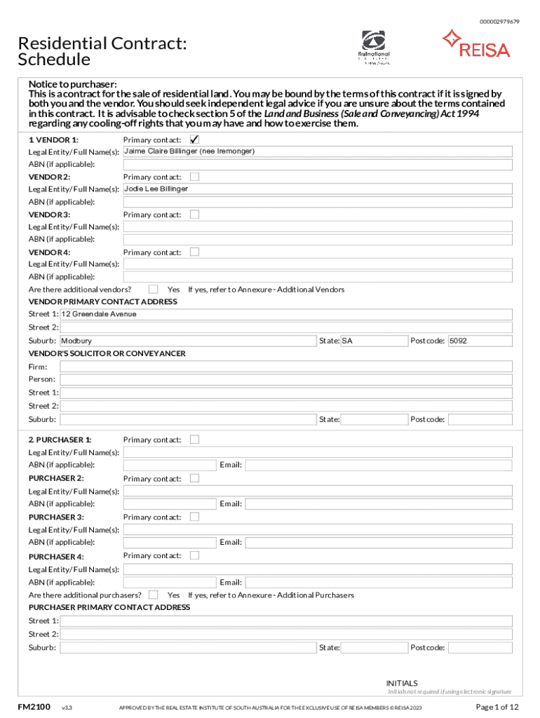 000002979679Residential Contract: Schedule Notice to purchaser: This is a contract for the sale of residential land. You may be bound by the terms of this contract if it is signed by both you and