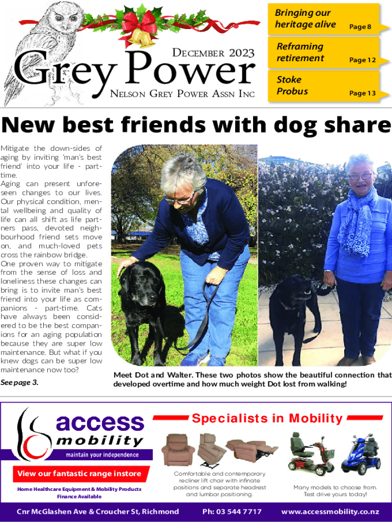 Grey Power December 2023Nelson Grey Power Assn Infringing our heritage alive Page 8Reframing retirement Page 12Stoke ProbusPage 13New best friends with dog share Mitigate the downsides of aging by