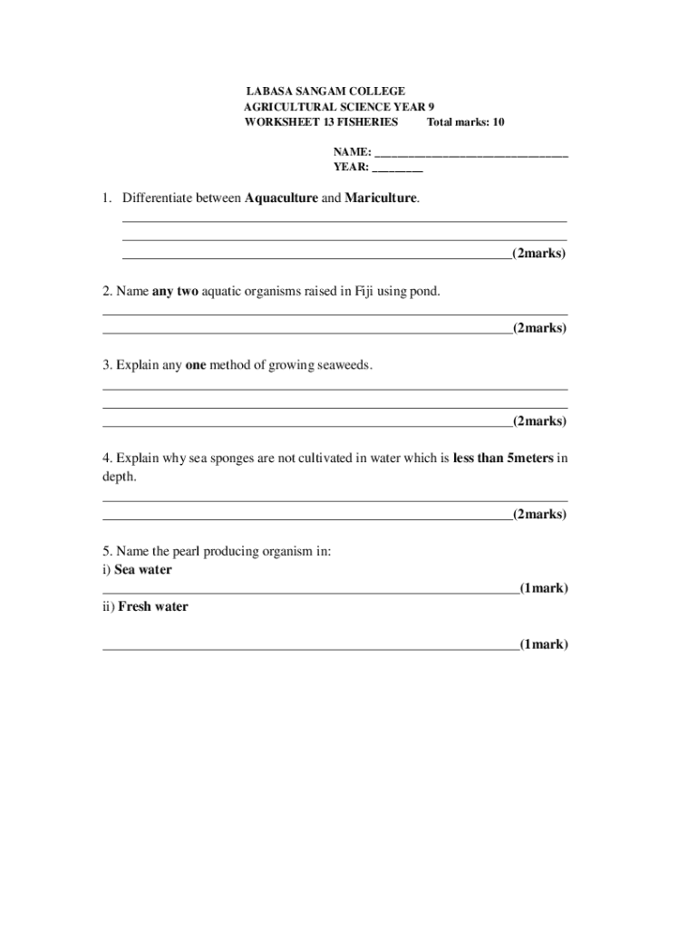 LAB ASA SAN GAM COLLEGE AGRICULTURAL SCIENCE YEAR 9 WORKSHEET 13 FISHERIES Total marks: 10 NAME: ___ YEAR: ___1. Differentiate between Aquaculture and Mari culture. ___ ___ ___(2marks) 2. Name any