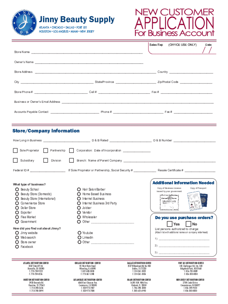 NEW CUSTOMERAPPLICATION For Business Account Jinny Beauty Supply ATLANTA CHICAGO DALLAS FORT LEE HOUSTON LOS ANGELES MIAMI NEW JERSEYS ales Rep(OFFICE USE ONLY)DateS tore Name ___ Owners Name ___
