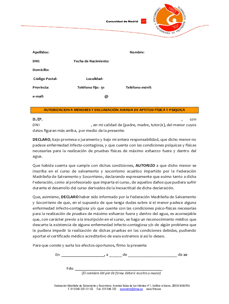 Obtener el gratis AUTORIZACION A MENORES Y DECLARACIN JURADA DE APTITUD FSICA Y PSIQUICA