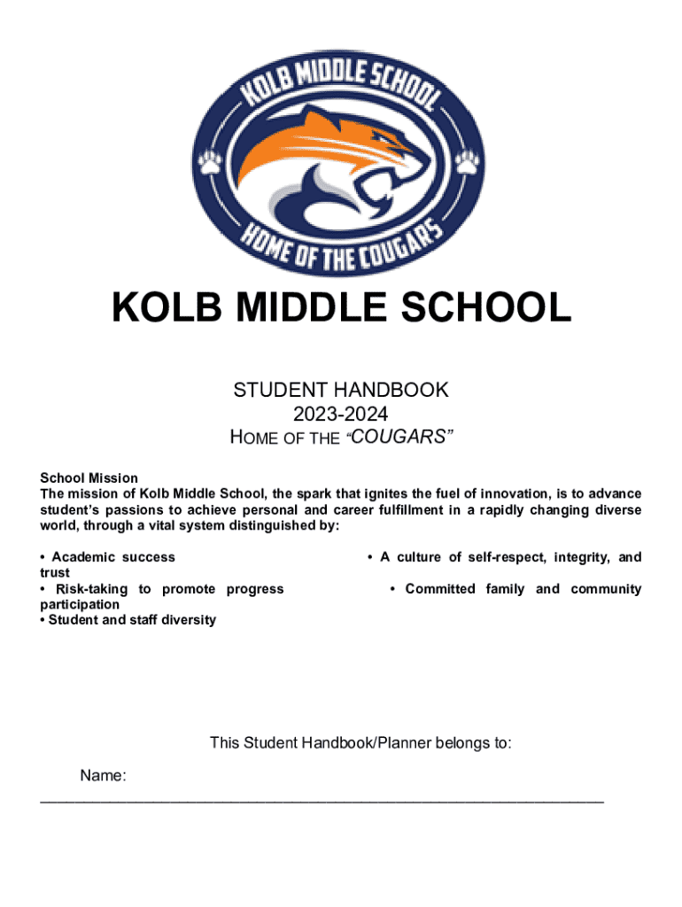 KOLA MIDDLE SCHOOL STUDENT HANDBOOK 20232024 HOME OF THE COUGARS School Mission The mission of Kola Middle School, the spark that ignites the fuel of innovation, is to advance students passions to
