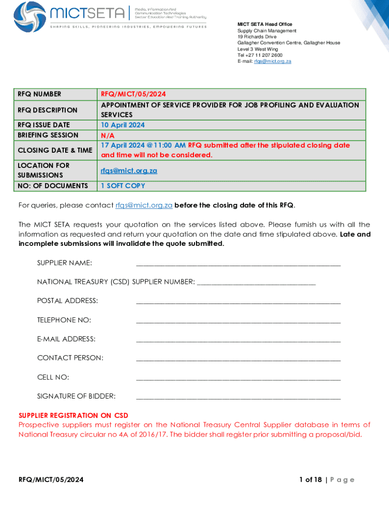 MICT SETA Head Office Supply Chain Management 19 Richards Drive Gallagher Convention Centre, Gallagher House Level 3 West Wing Tel +27 11 207 2600 Email: rfqs@mict.org.zaRFQ NUMBER RFQ DESCRIPTION