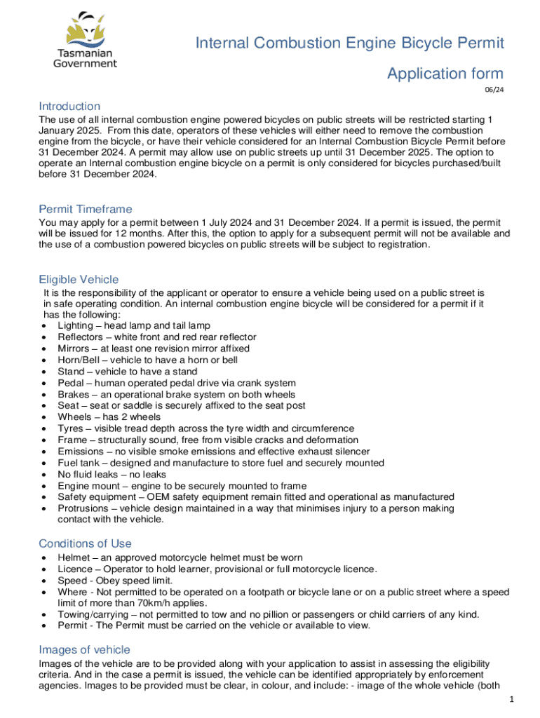 Internal Combustion Engine Bicycle Permit Application form 06/24Introduction The use of all internal combustion engine powered bicycles on public streets will be restricted starting 1 January 2025.