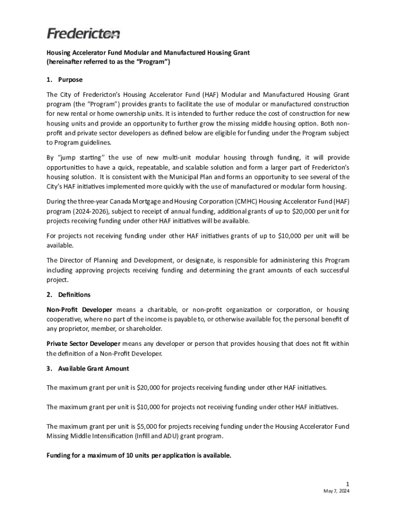 Housing Accelerator Fund Modular and Manufactured Housing Grant (hereinafter referred to as the Program) 1. Purpose The City of Frederictons Housing Accelerator Fund (HAF) Modular and Manufactured