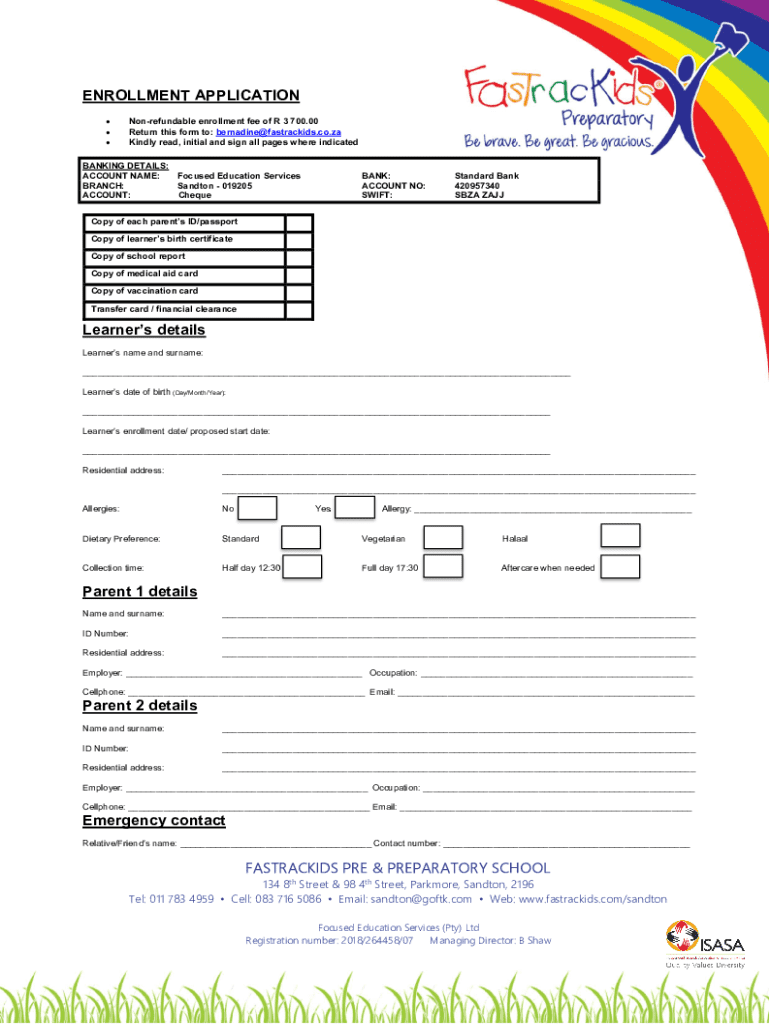 ENROLLMENT APPLICATION Nonrefundable enrollment fee of R 3 700.00 Return this form to: bernadine@fastrackids.co.za Kindly read, initial and sign all pages where indicatedBANKING DETAILS: ACCOUNT NAME: