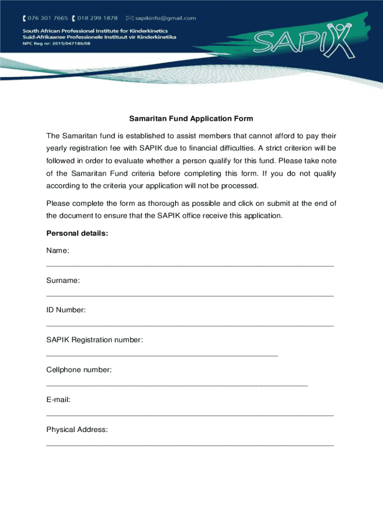 Samaritan Fund Application Form The Samaritan fund is established to assist members that cannot afford to pay their yearly registration fee with SAPIK due to financial difficulties. A strict criterion