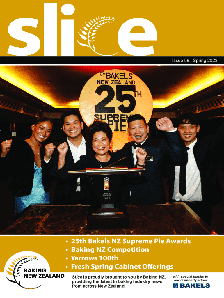 Issue 58: Spring 2023 25th Bakels NZ Supreme Pie Awards Baking NZ Competition Yarrows 100th Fresh Spring Cabinet Oerings Slice is proudly brought to you by Baking NZ, providing the latest in baking
