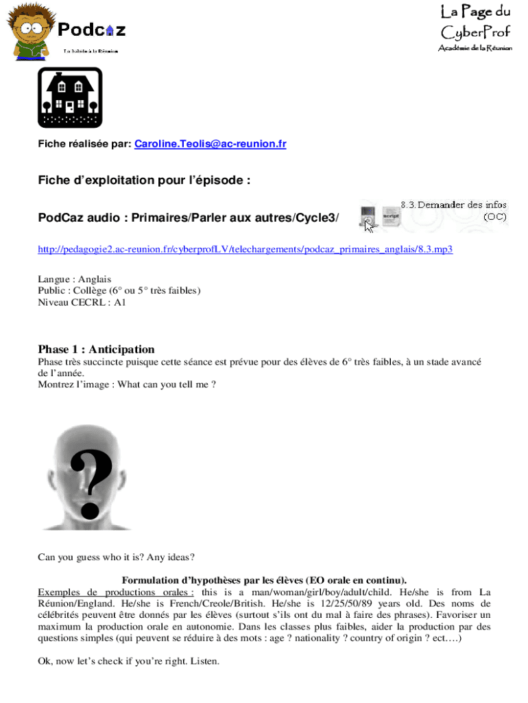 La Page du CyberProf Acadmie de la RunionFiche ralise par: Caroline.Teolis@acreunion.frFiche dexploitation pour lpisode : PodCaz audio : Primaires/Parler aux autres/Cycle3/ http://pedagogie2.acreunion.fr/cyberprofLV/telechargements/podcaz_primaires_anglais/8.3.mp3