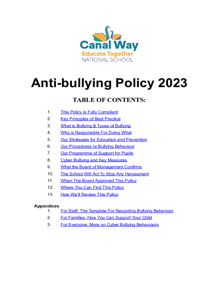 Antibullying Policy 2023 TABLE OF CONTENTS: 1.This Policy is Fully Compliant2.Key Principles of Best Practice3.What is Bullying & Tyoes of Bullying4.Who is Responsible For Doing What5.Our Strategies