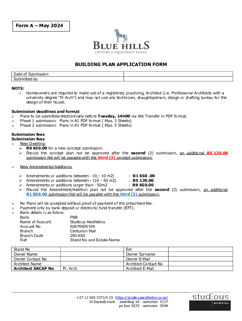 Form A May 2024BUILDING PLAN APPLICATION FORM Date of Submission Submitted by NOTE: o Homeowners are required to make use of a registered, practicing, Architect (i.e. Professional Architects with
