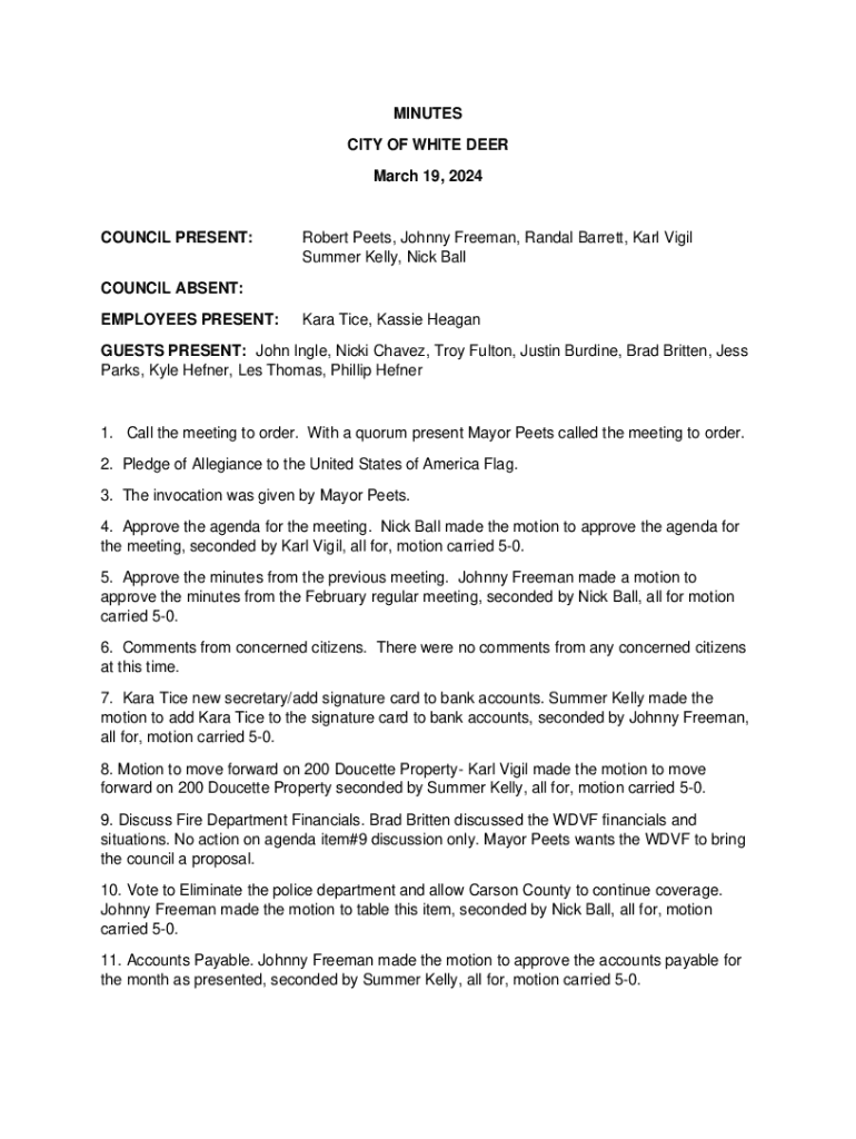 MINUTES CITY OF WHITE DEER March 19, 2024COUNCIL PRESENT:Robert Meets, Johnny Freeman, Randal Barrett, Karl Vigil Summer Kelly, Nick BallCOUNCIL ABSENT: EMPLOYEES PRESENT:Kara Time, Cassie HeaganGUESTS