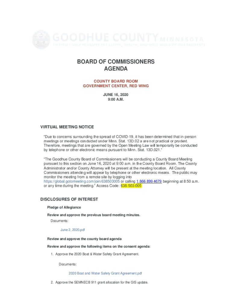 BOARD OF COMMISSIONERS AGENDA COUNTY BOARDroom GOVERNMENT CENTER, RED WING JUNE 16, 2020 9:00 A.M.VIRTUAL MEETING NOTICE Due to concerns surrounding the spread of COVID-19, it has been determined