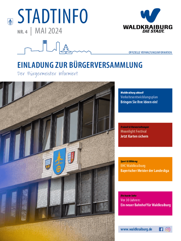 | MAI 2024NR. 4OFFIZIELLE VERWALTUNGSINFORMATIONEINLADUNG OUR BRGERVERSAMMLUNGDer Burgomaster informiertWaldkraiburg aktuellVerkehrsentwicklungsplan