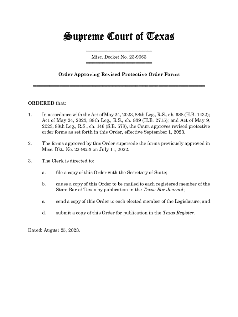 Supreme Court of Texas Misc. Docket No. 239063 Order Approving Revised Protective Order Forms ORDERED that: 1. In accordance with the Act of May 24, 2023, 88th Leg., R.S., ch. 688 (H.B. 1432); Act
