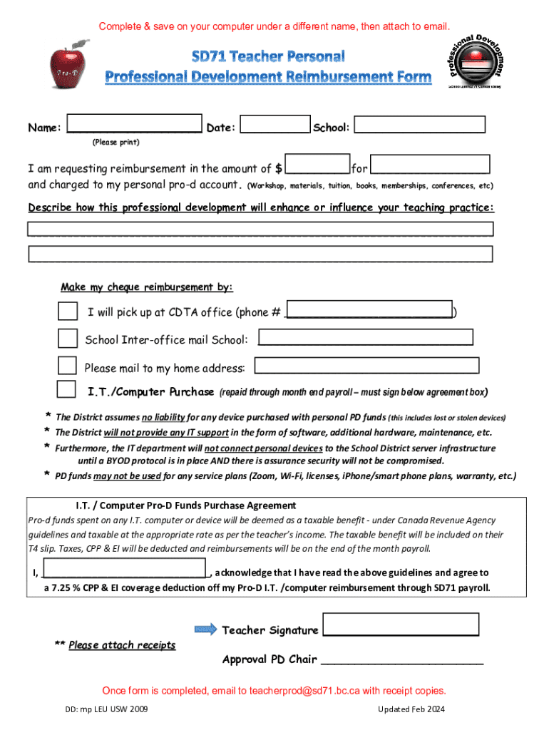 sd71 Teacher Pro-D Reimbursement is not the form you're looking for?Search for another form here.