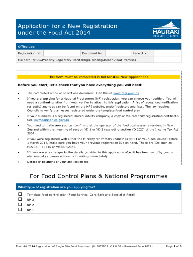 Application for a New Registration under the Food Act 2014 Office use: Registration ref:Document No. Receipt No. File path: Property Regulatory MonitoringLicensingHealthFood PremisesThis form must