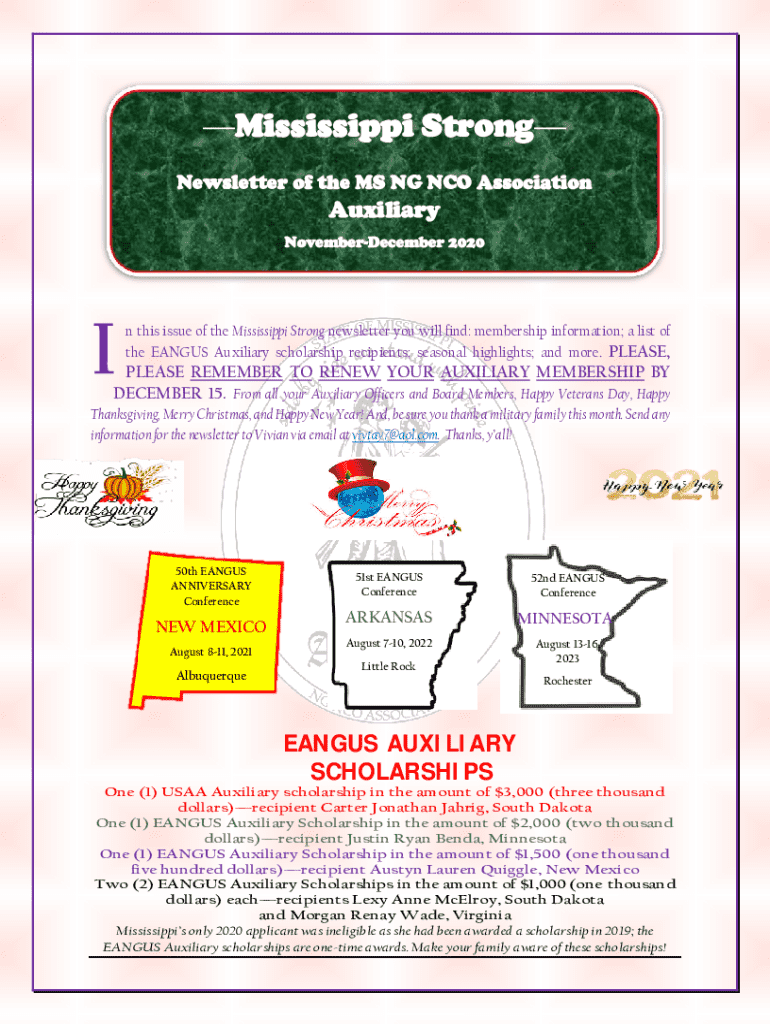Mississippi Strong Newsletter of the MS NG NCO AssociationAuxiliary NovemberDecember 2020In this issue of the Mississippi Strong newsletter you will find: membership information; a list of the EANGUS