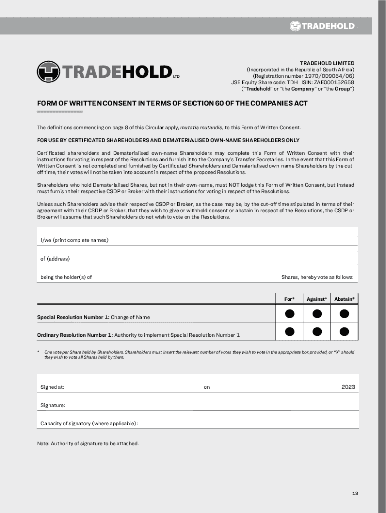 CIRCULAR TO TRADEHOLD SHAREHOLDERS Date of issue: Thursday, 13 April 2023THIS CIRCULAR IS IMPORTANT AND REQUIRES YOUR IMMEDIATE ATTENTION The definitions and interpretations commencing on page 8 of