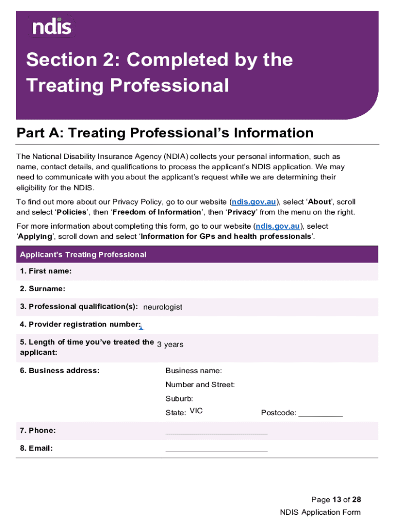 Section 2: Completed by the Treating Professional Part A: Treating Professionals Information The National Disability Insurance Agency (INDIA) collects your personal information, such as name, contact