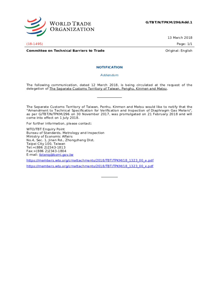 Template The Separate Customs Territory of Taiwan, Penhu, Kinmen and Matsu would like to notify that the "Amendment to Technical Specification for Verification and Inspection of Diaphragm Gas Meters", as per G/TBT/N/TPKM/296 on 30 November 2017, was instructions