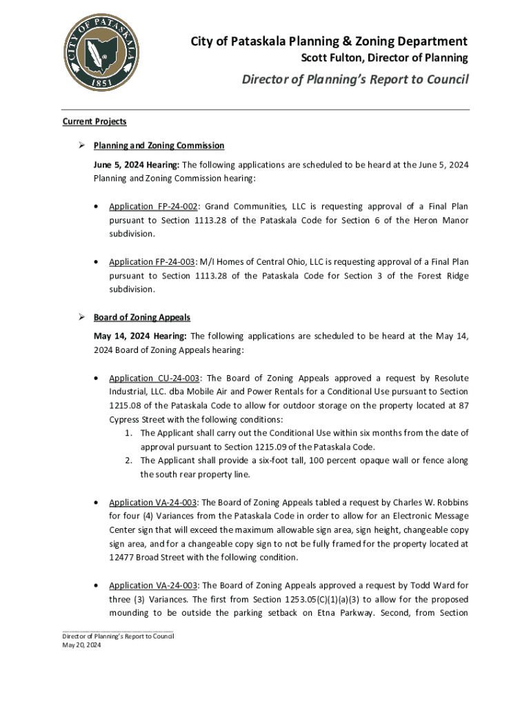 City of Katakana Planning & Zoning Department Scott Fulton, Director of PlanningDirector of Plannings Report to Council Current Projects Planning and Zoning Commission June 5, 2024, Hearing: The following