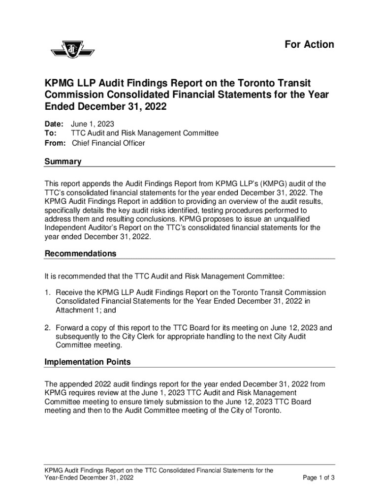 For ActionKPMG LLP Audit Findings Report on the Toronto Transit Commission Consolidated Financial Statements for the Year Ended December 31, 2022 Date: June 1, 2023 To: TTC Audit and Risk Management