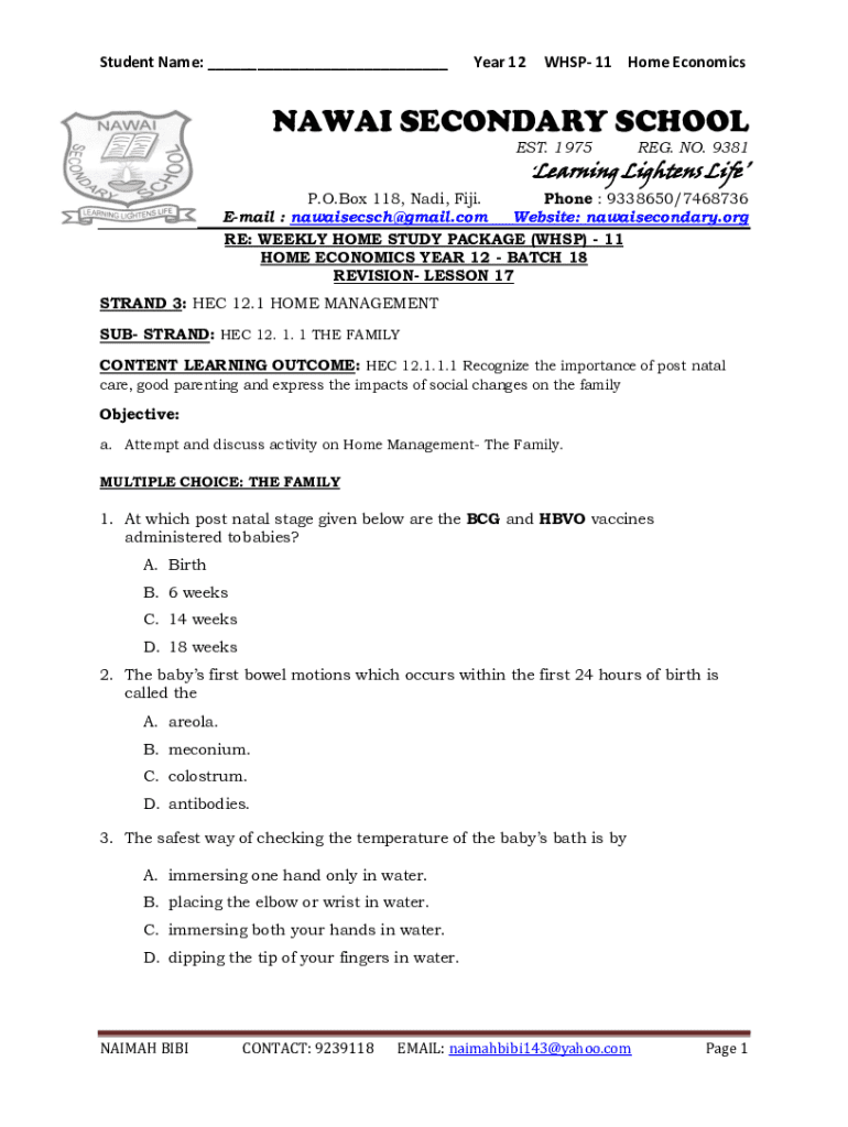 Student Name: ___Year 12WHSP 11 Home EconomicsNAWAI SECONDARY SCHOOL EST. 1975REG. NO. 9381 Learning Lightens LifeP.O.Box 118, Nadi, Fiji. Phone : 9338650/7468736 Email : nawaisecsch@gmail.com Website: