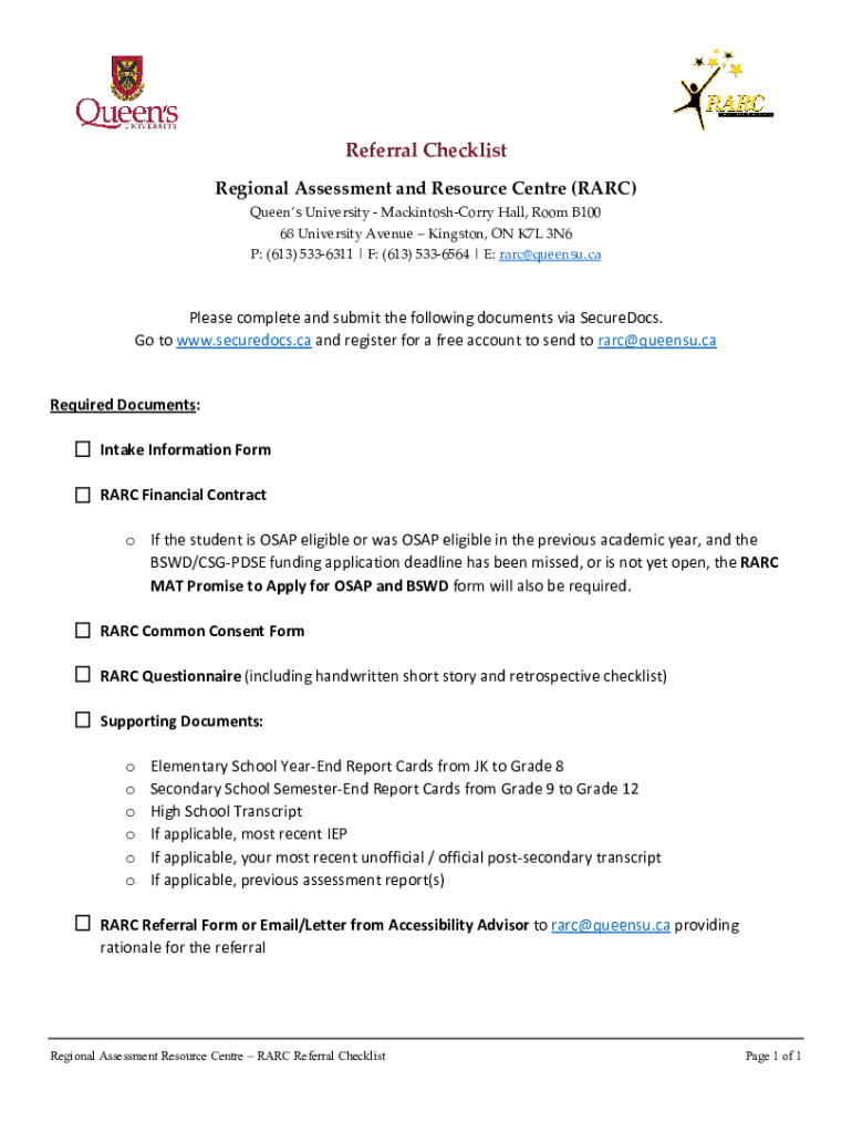 Referral Checklist Regional Assessment and Resource Center (RARE) Queen's University University MackintoshCorry Hall, Room B100 68 University Avenue Kingston, ON K7L 3N6 P: (613) 5336311 | F: (613)