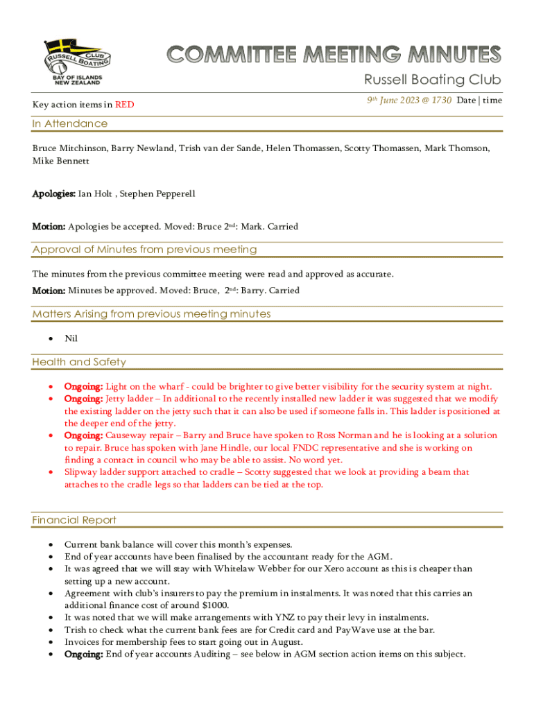 Russell Boating Club Key action items in RED9th June 2023 @ 1730 Date | timeIn Attendance Bruce Mitchinson, Barry Newland, Trish van der Sande, Helen Thomassen, Scotty Thomassen, Mark Thomson, Mike