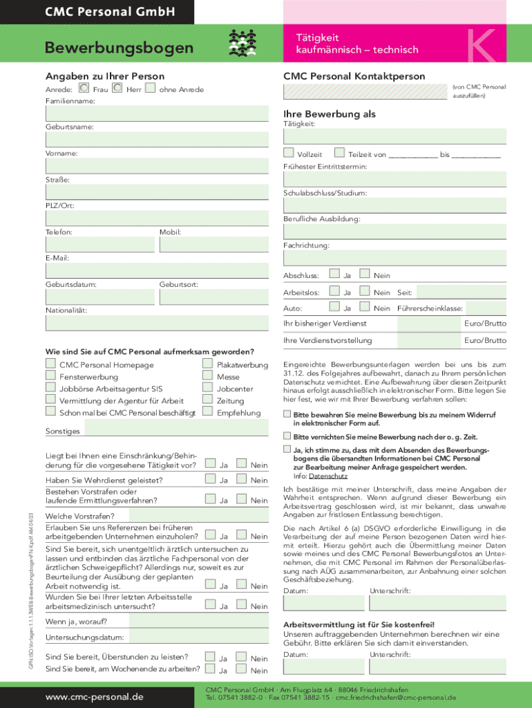kaufmnnisch technischBewerbungsbogenCMC Personal Kontaktperson(on CMC Personalize Anredeauszufllen)Familienname:Ire Boomerang ALS
