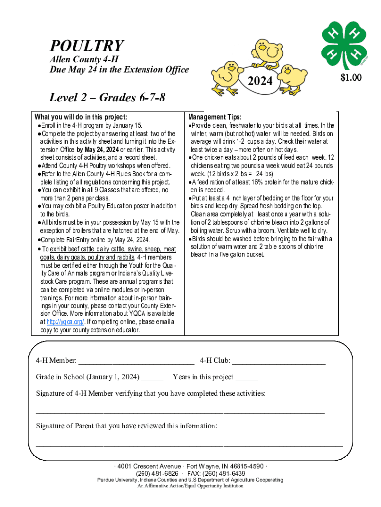 POULTRYAllen County 4H Due May 24 in the Extension Office$1.002024Level 2 Grades 678 What you will do in this project: Enroll in the 4H program by January 15.Management Tips:Complete the project by