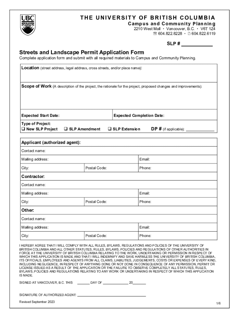 THE UNIVERSITY OF BRITISH COLUMBIACampus and Community Planning2210 West Mall Vancouver, B.C. V6T 1Z4 604.822.8228 604.822.6119SLP #Streets and Landscape Permit Application FormComplete application