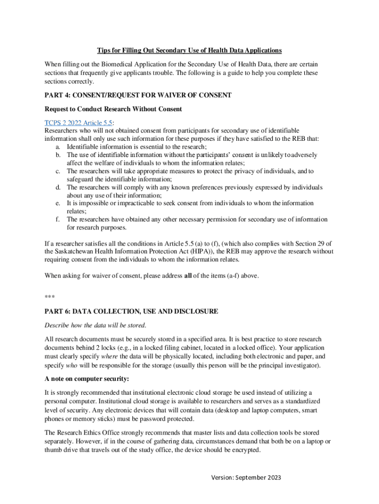 Tips for Filling Out Secondary Use of Health Data Applications When filling out the Biomedical Application for the Secondary Use of Health Data, there are certain sections that frequently give applicants