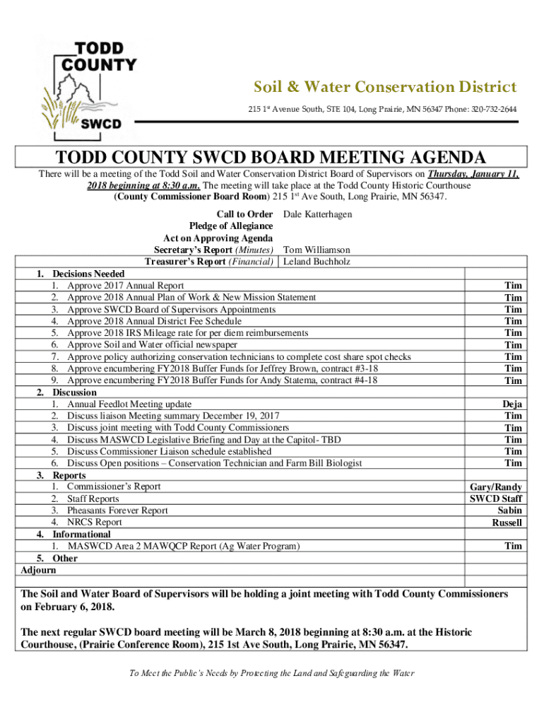 Soil & Water Conservation District 215 1st Avenue South, STE 104, Long Prairie, MN 56347 Phone: 3207322644TODD COUNTY SACD BOARD MEETING AGENDA There will be a meeting of the Todd Soil and Water Conservation