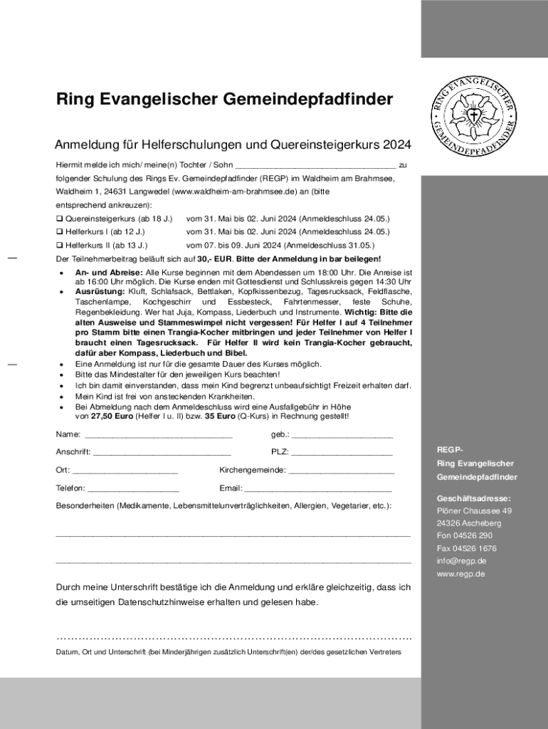 Fülle das Anmeldeformular des Rings der Evangelischen Gemeindepfadfinder aus.