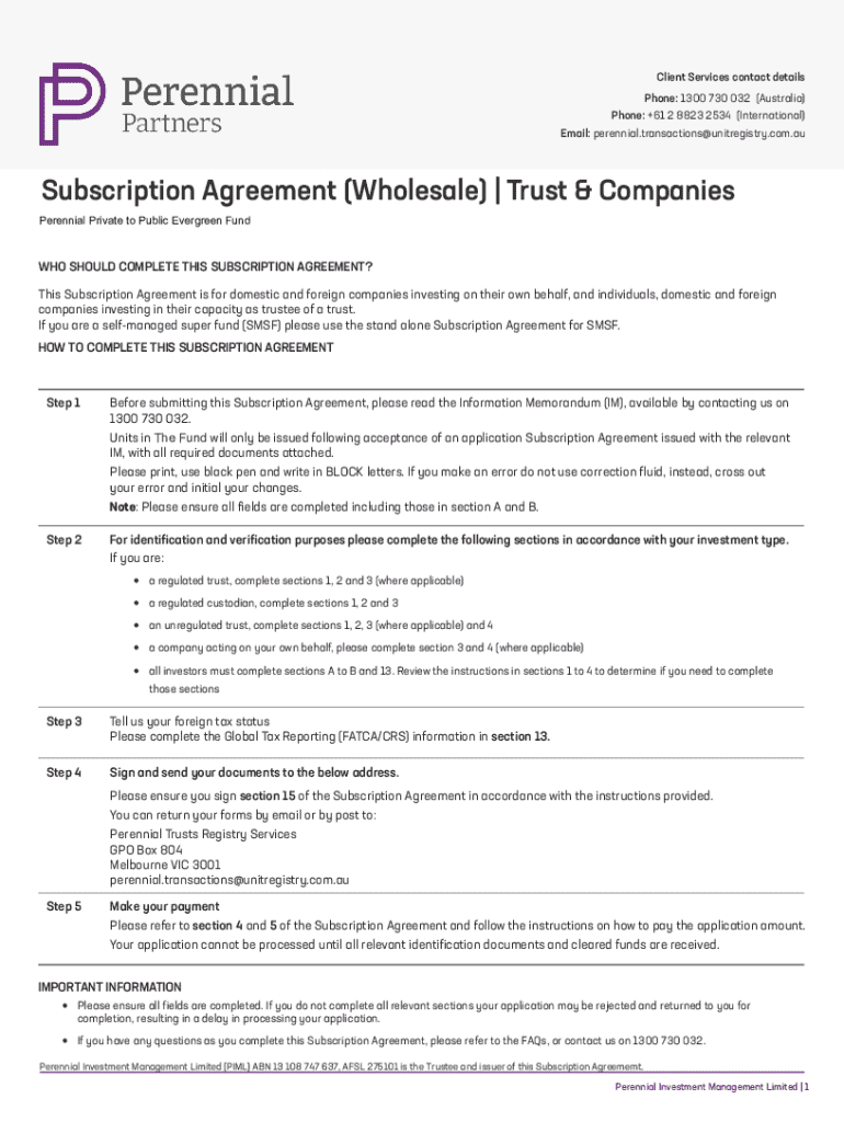 Client Services contact details Phone: 1300 730 032 (Australia) Phone: +61 2 8823 2534 (International) Email: perennial.transactions@unitregistry.com.auSubscription Agreement (Wholesale) | Trust &