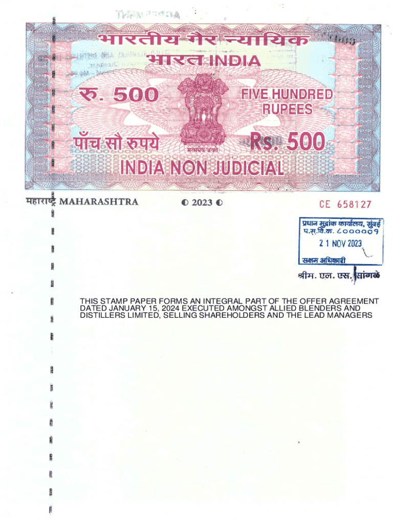 THIS STAMP PAPER FORMS AN INTEGRAL PART OF THE OFFER AGREEMENT DATED JANUARY 15, 2024, EXECUTED AMONGST ALLIED BLENDERS AND DISTILLERS LIMITED, SELLING SHAREHOLDERS AND THE LEAD MANAGERSTHIS STAMP