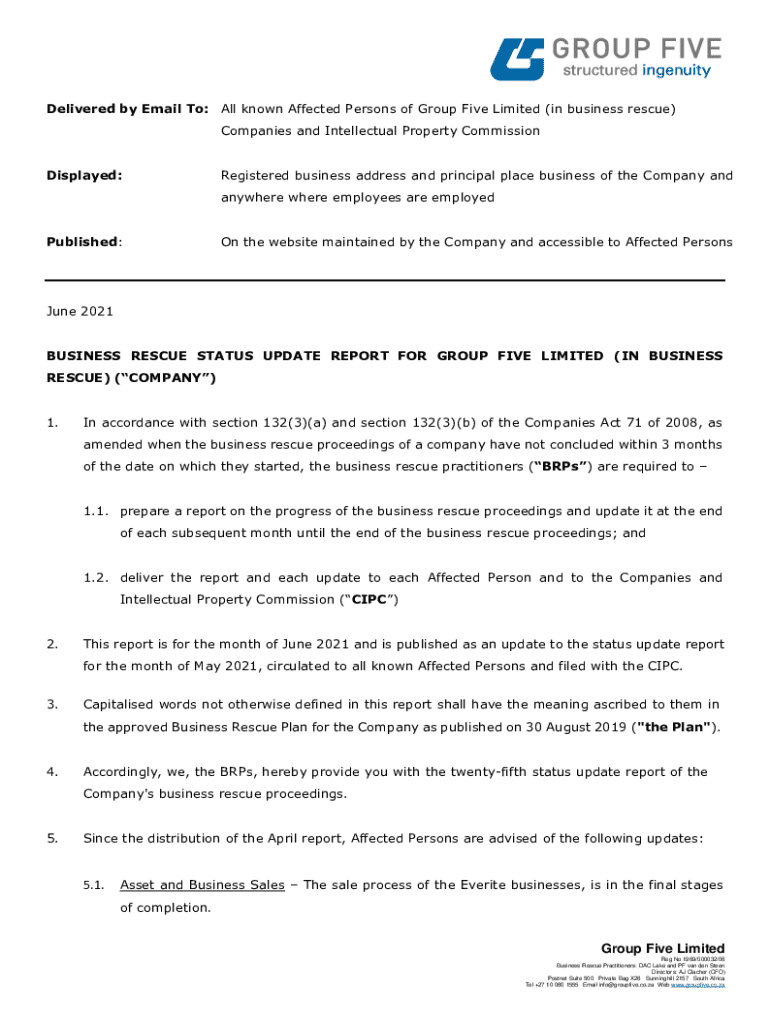 Delivered by Email To: All known Affected Persons of Group Five Limited (in business rescue) Companies and Intellectual Property Commission Displayed:Registered business address and principal place