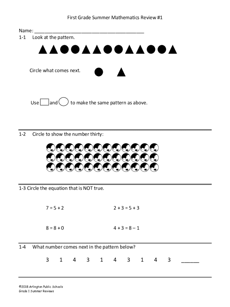 First Grade Summer Mathematics Review #1 Name: ___ 11 Look at the pattern. Circle what comes next. Use12andto make the same pattern as above. Circle to show the number thirty: 13 Circle the equation
