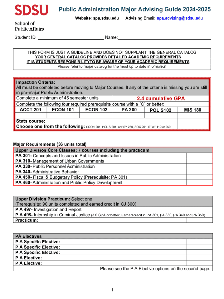 Public Administration Major Advising Guide 20242025 Website: spa.SDSU.advising Email: spa.advising@sdsu.eduStudent ID: ___ Name:___ THIS FORM IS JUST A GUIDELINE AND DOES NOT SUPPLANT THE GENERAL