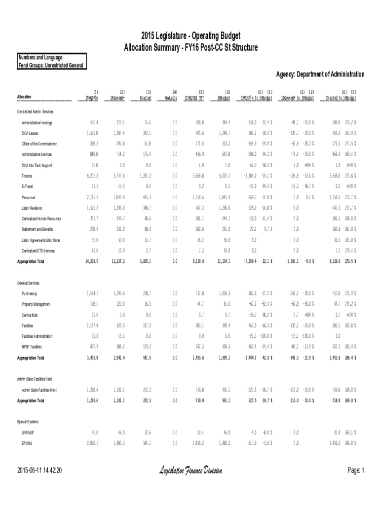 2015 Legislature Operating Budget Allocation Summary FY16 PostCC St Structure Numbers and Language Fund Groups: Unrestricted GeneralAgency: Department of Administration Allocation ___[1] 15MgtPln
