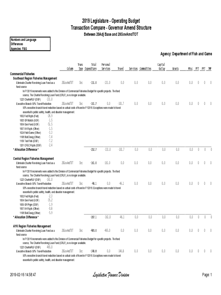 2019 Legislature Operating Budget Transaction Compare Governor Amend Structure Between 20Adj Base and 20GovAmdTOT Numbers and Language Differences Agencies: Agency: Department of Fish and Game Trans
