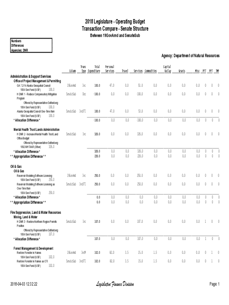 2018 Legislature Operating Budget Transaction Compare Senate Structure Between 19GovAmd and Senates Numbers Differences Agencies: Agency: Department of Natural Resources Trans Total Personal Capital