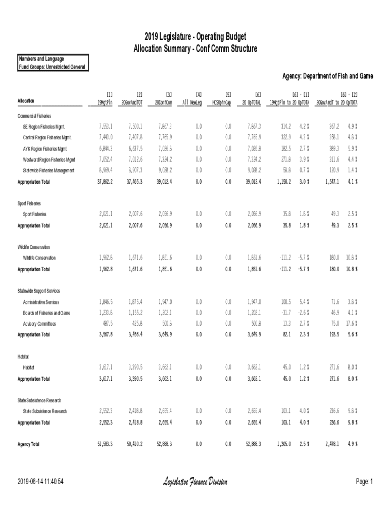 2019 Legislature Operating Budget Allocation Summary Cone Comm Structure Numbers and Language Fund Groups: Unrestricted GeneralAgency: Department of Fish and Game [1] 19MgtPln ___[2] 20GovAmdTOT ___[3]