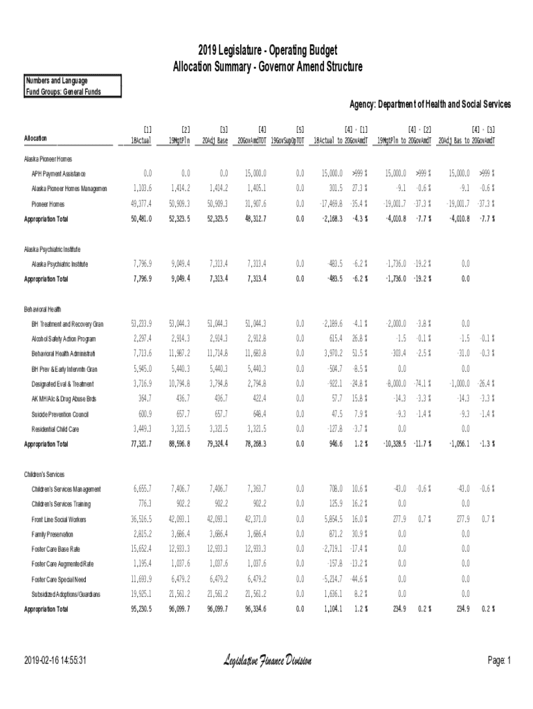 2019 Legislature Operating Budget Allocation Summary Governor Amend Structure Numbers and Language Fund Groups: General FundsAgency: Department of Health and Social Services Allocation ___[1] 18Actual